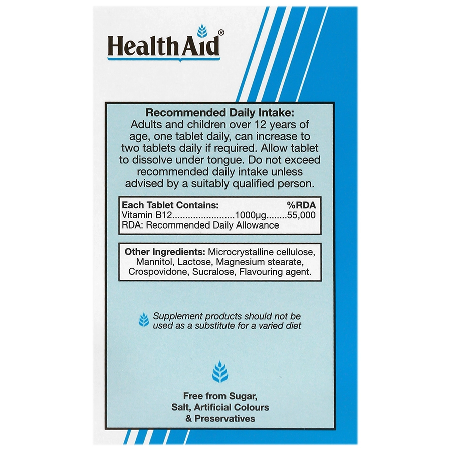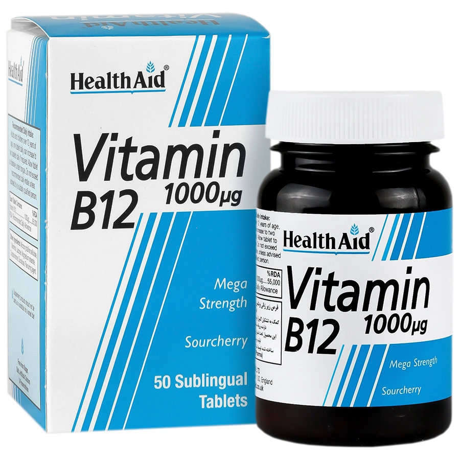 قرص ویتامین B12 ۱۰۰۰ میکروگرم هلث اید مکمل ساخت کشور انگلستان و جهت درمان کمبود ویتامین مهمی مانند ویتامین ب12 است. ویتامین B12 بزرگترین و پیچیدهترین ساختار را در بین ویتامینها دارد. این ویتامین بهصورت طبیعی در محصولات گوشتی یافت میشود و تنها تولید صنعتی آن از طریق سنتز تخمیر باکتریایی انجام میشود. ویتامین ب۱۲ یا کوبالامین یک ویتامین حساس و مهم برای بدن است. این ویتامین برای تکثیر سلولی (خونسازی) و عملکرد سیستم عصبی ضروری است. این ویتامین بسیار حساس بوده و قابلیت تحمل نور، حرارت و مواد اسیدی و قلیایی را ندارد. باکتریهای تولیدکننده ب۱۲ در دستگاه گوارش انسان، از دهان و لثه و حلق تا روده بزرگ، زندگی میکنند.
