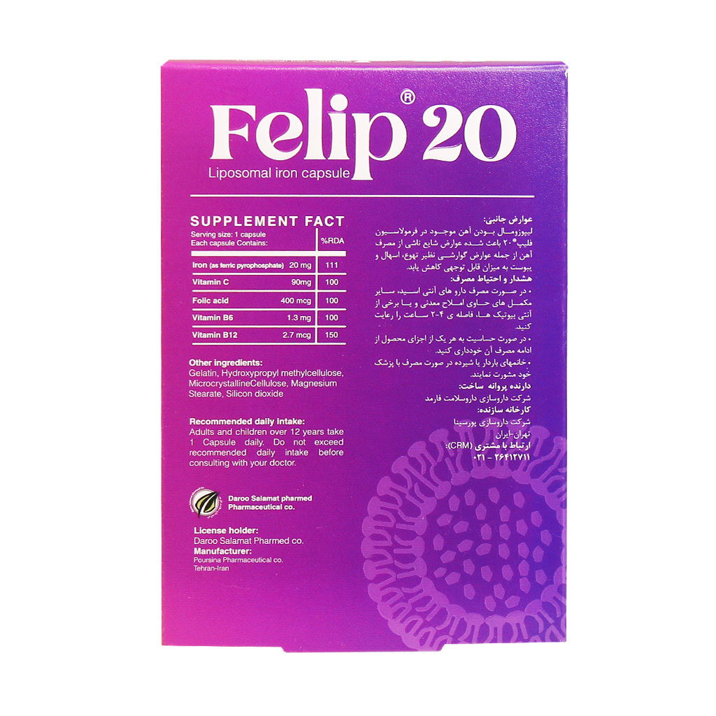 کپسول فلیپ 20 های هلث به تامین آهن مورد نیاز بدن میپردازد. این مکمل از بروز کمخونی ناشی از فقر آهن جلوگیری کرده و با وجود ویتامین C سبب بهبود و افزایش میزان جذب آهن میشود. این کپسول در ترکیبات خود انواع ویتامینهای گروه B را دارد که بهطور مستقیم بر سطح انرژی، سلامت مغز و بهبود وضعیت جسمانی و روانی فرد اثرگذار است. ویتامین سی موجود در این محصول علاوه بر افزایش جذب آهن با خاصیت آنتی اکسیدانی بسیار قوی نقش بسزایی در بهبود عملکرد سیستم ایمنی بدن افراد دارد. آهن موجود در این فرآورده به صورت لیپوزومال است. لیپوزومال بودن آهن موجود در فرمولاسیون فلیپ 20 باعث شده عوارض شایع ناشی از مصرف آهن از جمله عوارض گوارشی نظیر تهوع، اسهال و یبوست به میزان قابل توجهی کاهش یابد. برای خرید بهترین قرص آهن میتوانید به سایت داروخانه آنلاین مثبت سبز مراجعه نمایید.