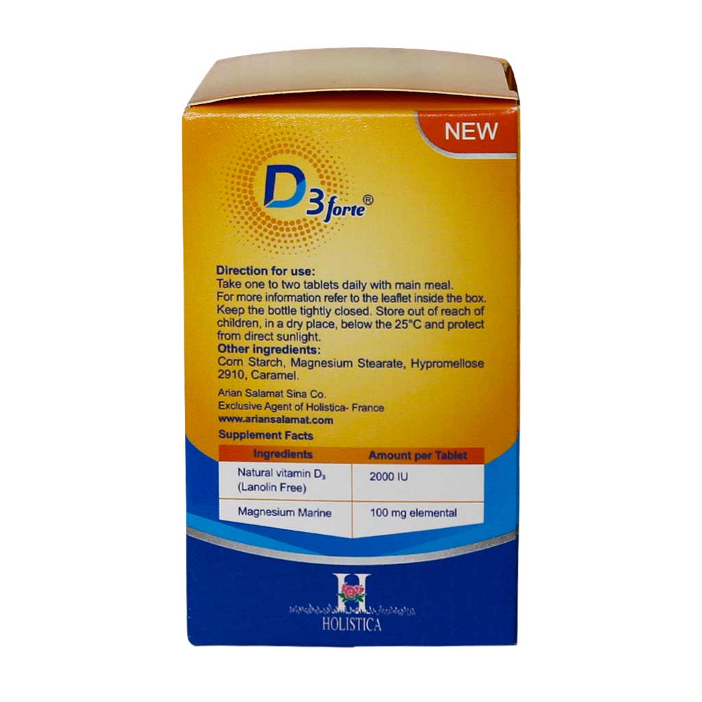 قرص ویتامین D3 فورت 2000 واحد هولیستیکا از منبع طبیعی غیر حیوانی و غنی شده با منیزیم دریایی ساخته شده است. این مکمل موجب درمان پوکی استخوان، نرمی استخوان و ریکتنز می‌شود.