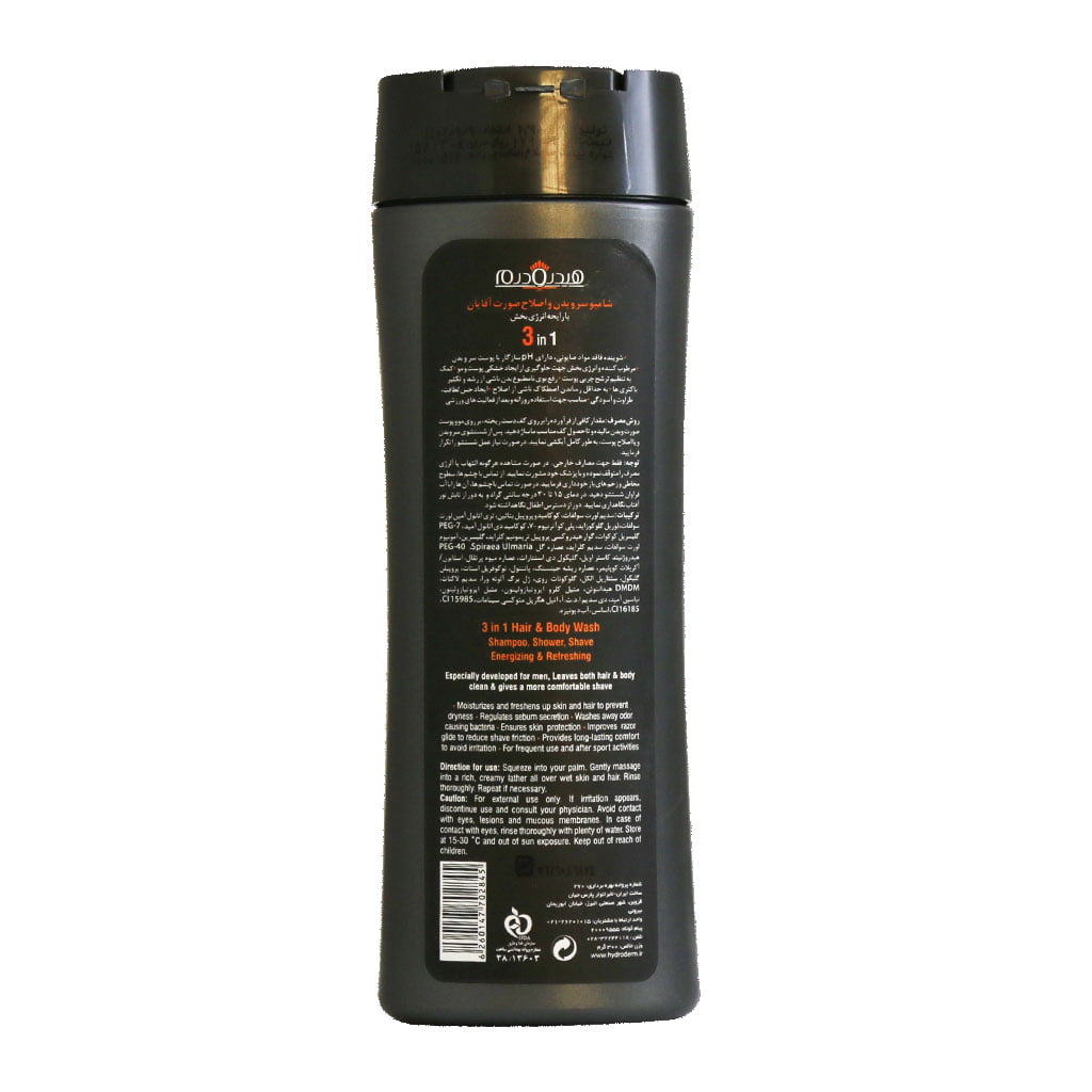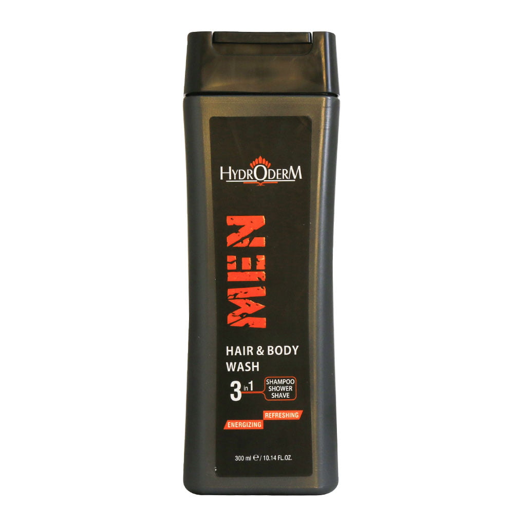 شامپو انرژی بخش 3 در 1 آقایان هیدرودرم محصولی است که به کمک آن می‌توانید موهای خود را بشویید، پوست بدن خود را شستشو دهید و قبل از اصلاح صورت آن را روی پوست خود بمالید تا کف کند و به این ترتیب از ایجاد زخم و قرمزی جلوگیری شود. به همین دلیل است که نام آن را شامپوی 3 in 1 هیدرودرم گذاشته اند. این محصول PH سازگار با پوست سر و بدن داشته و فاقد مواد صابونی است. این شامپو موی معمولی را به صورت روزانه و پس از فعالیت‌های ورزشی می‌توان استفاده کرد تا به رفع بوی نامطبوع بدن که ناشی از رشد و تکثیر باکتری‌هاست، کمک شود. شامپو سر و بدن و اصلاح صورت آقایان هیدرودرم همراه با رایحه‌ای انرژی بخش حس لطافت، طراوت و آسودگی را به شما هدیه خواهد داد. این محصول با تنظیم ترشح چربی پوست، مو و پوست شما را نرم و لطیف کرده و از خشکی جلوگیری می‌نماید. عصاره پرتقال، عصاره ریشه جینسنگ و ژل برگ آلوئه ورا از ترکیبات گیاهی موجود در این شامپو مو مردانه هستند.