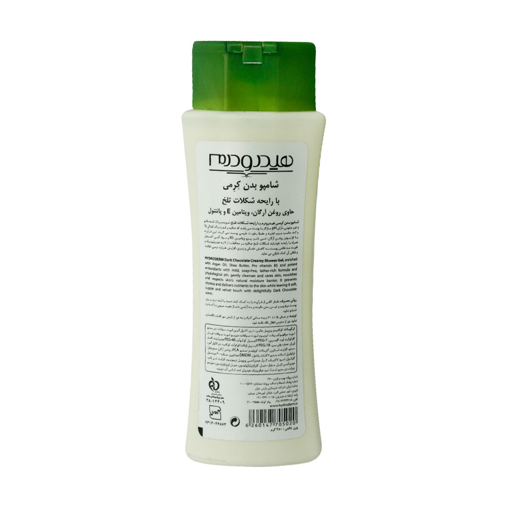 شامپو بدن کرمی هیدرودرم با رایحه شکلات تلخ شوینده و پاک کننده ملایم بوده که به حفظ رطوبت طبیعی پوست و کاهش خشکی و زبری آن کمک می‌کند.