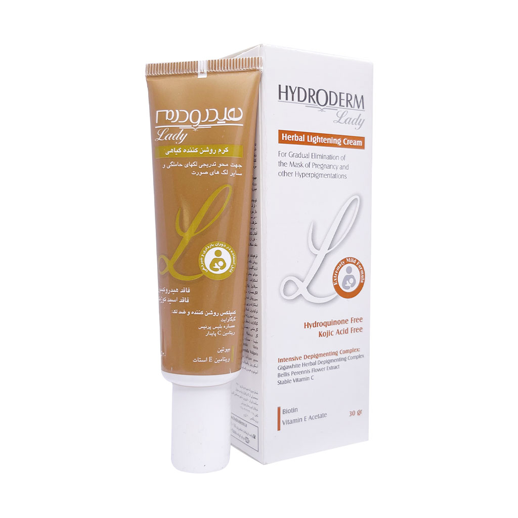 کرم روشن کننده گیاهی هیدرودرم با عصاره‌های گیاهی بر پایه کمپلکس روشن کننده و ضد لک تولیده شده است. این کرم با گیگاوایت و ویتامین c پایدار جهت از بین بردن موثر تدریجی لک‌های قهوه‌ای پوست صورت و گردن ناشی از بارداری و سایر موارد استفاده می‌شود. همانطور که می‌دانید عوامل متعددی سبب ایجاد لک‌های قهوه‌ای در پوست صورت و گردن می‌شوند؛ این عوامل شامل اثرات بارداری، قرار گرفتن در معرض اشعه ماورای بنفش نور خورشید، کک و مک و افزایش سن است. در این میان مواد موثر موجود در کرم روشن کننده صورت هیدرودرم سری Lady برای نخستین بار، لابراتوار پارس حیان تولید کرده است. این ترکیبات با کنترل عملکرد آنزیم‌های موثر، از انتقال ملانوزوم‌های حاوی ملانین به سلول‌های لایه بیرونی پوست ممانعت به عمل آورده و بدین ترتیب از ایجاد لک‌های پوستی جلوگیری می‌نماید. برای خرید کرم روشن کننده بدن به سایت مثبت سبز مراجعه نمایید.