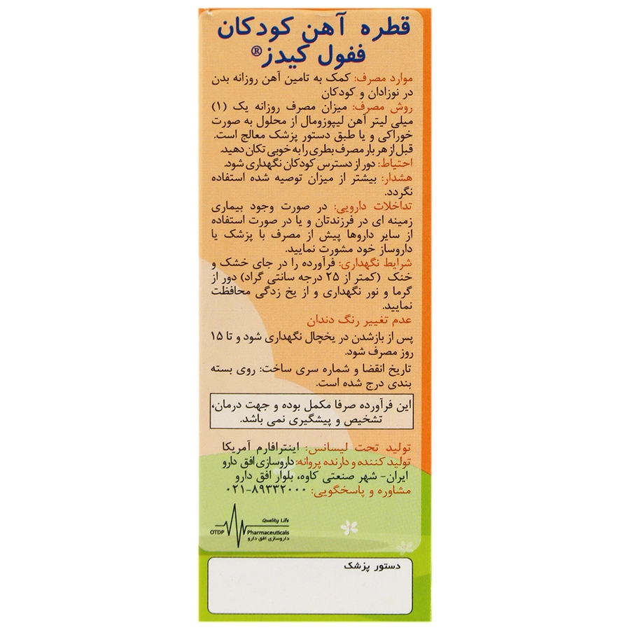 قطره ففول کیدز یک مکمل غذایی مخصوص کودکان حاوی ۷ میلیگرم آهن المنتال (Elemental Iron) در هر میلیلیتر است که برای تامین آهن مورد نیاز در کودکان بالای ۶ ماه طراحی شده است. قطره ففول کیدز تحت امتیاز و لیسانس شرکت اینترافارم کشور آمریکا و دارنده پروانه از داروسازی افق دارو است و بطریهای شیشهای 15 میلیلیتری عرضه میشود. فرم قطرهای ففول کیدز و استقرار قطرهچکان، مصرف را برای کودکان آسان کرده و به دلیل فرم لیپوزومال احتمال سیاهی دندان اندک است.