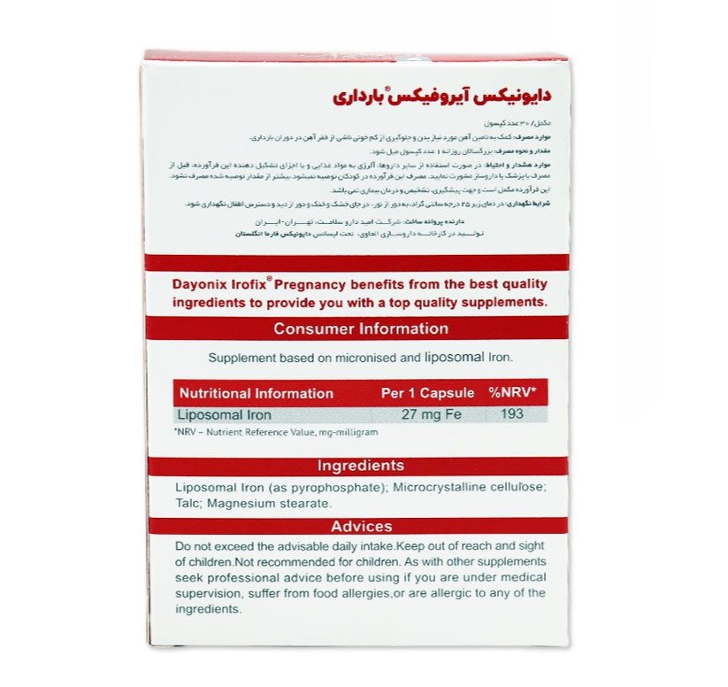 کپسول آیروفیکس بارداری دایونیکس فارما یک مکمل آهن پیشرفته و ویژه برای بانوان باردار است که به شکل کپسول و در بستههای 30 عددی عرضه میشود. این محصول حاوی 27 میلی گرم آهن لیپوزومال است که به تامین آهن مورد نیاز بدن، پیشگیری و درمان کم خونی ناشی از فقر آهن کمک میکند و از عوارضی مانند خستگی، ضعف و کاهش اکسیژن رسانی به بدن مادر و جنین جلوگیری میکند. فرم آهن موجود در این مکمل به صورت لیپوزومال بوده که هم به افزایش جذب آهن کمک کرده و هم عوارض گوارشی را به حداقل رسانده است. این مکمل تحت لیسانس شرکت دایونیکس فارما انگلستان و در کارخانه داروسازی الحاوی در ایران تولید و بسته بندی میشود.