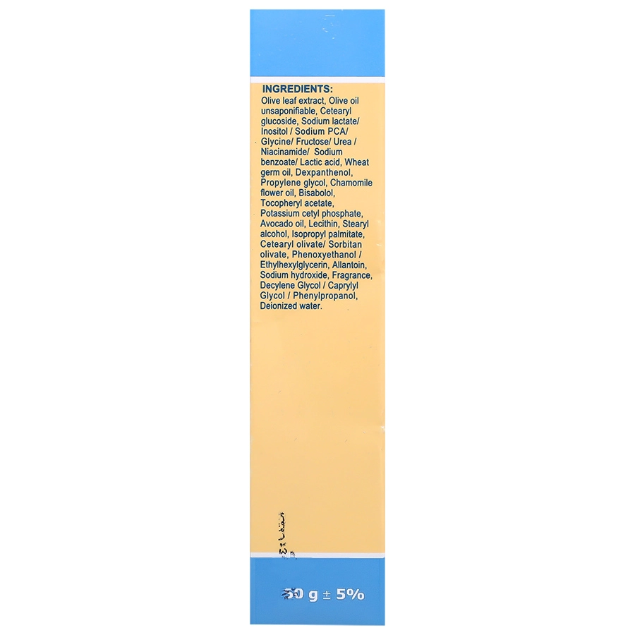 آب دیونیزه ، عصاره برگ زیتون، بخش غیر صابونی شونده زیتون (درمولن)، ستئاریل گلوکوزید، کمپلکس لاکتیل، روغن جوانه گندم، دپانتنول (پیش ساز ویتامین B5)، پروپیلن گلیکول، روغن بابونه، آلفا بیزابولول، آلفا توکوفرول استات (ویتامین E)، پتاسیم هگزا دسیل هیدروژن فسفات، روغن آووکادو، لسیتین، ستو استئاریل الکل، ایزو پروپیل پالمیتات، ستئاریل اولیوات، سوربیتان اولیوات، آلانتوئین، ایزوتیازولین 5/1 % و دیگر افزودنی ها ی مجاز