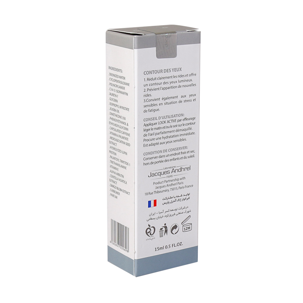 پوست حساس و نازک دور چشم به مراقبت ویژه و مخصوص نیاز دارد که در نتیجه افزایش سن و خستگی و کمبود آب پوست ناحیه اطراف دور چشم، باعث بروز حلقه های تیره و پف اطراف چشم می شود نوآوری در فرمول کرم دور چشم لوک اکتیو ژاک آندرل پاریس، شامل جینگو بیلوبا (Ginkgobiloba Extract) جهت تسهیل خونرسانی اطراف چشم ها، کافئین (Caffeine) به دلیل ویژگی های ضد التهابی و خواص آنتی اکسیدانی در کاهش تیرگی دور چشم، کلاژن جهت پیشگیری از پیری و افزایش خاصیت ارتجاعی پوست و کمک به کاهش چروک ها است. همچنین ترکیبی از پروتئین هیدرولیزشده لوپین (Lupine) و ویتامین E اجازه بازسازی قابل ملاحظه ای در ناحیه اطراف چشم ها را می دهد.