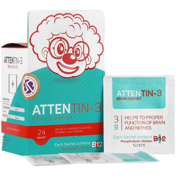 ساشه اتنتین 3 جهان فارمد آریا حاوی ال فسفورین، گلوتامین و ویتامین ب 12 یک مکمل مناسب جهت بهبود عملکرد مغز و اعصاب، افزایش توجه و تمرکز، افزایش قدرت یادگیری و … در کودکان بالای 3 سال و بزرگسالان است.