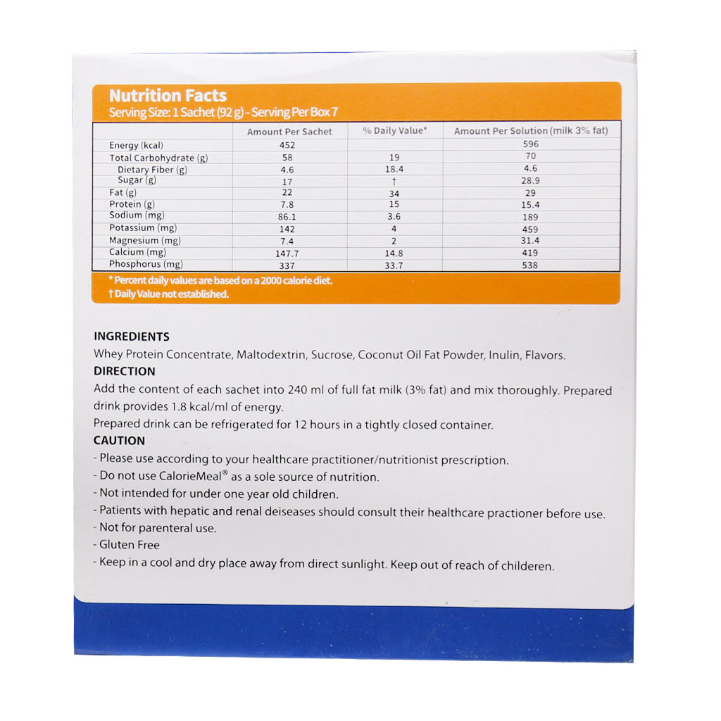 پودر کالری میل کارن با داشتن فیبر اینولین به بهبود عملکرد دستگاه گوارش کمک میکند. کالری میل یک غذای کمکی برای افرادی که دچار سوء تغذیه هستند و یا به بیماریهای سخت مانند سرطان، بیماری مزمن انسدادی ریه و یا حتی ایدز دچار هستند، مناسب است. به طور کلی میتوان گفت این مکمل به افرادی کمک میکند که بنا به دلایلی انرژی و توان برای انجام کارها ندارند. Calorie Meal با دارا بودن پروتئین، چربی و کربوهیدرات به منظور فراهم نمودن انرژی لازم برای رفع تعادل منفی انرژی و بهبود کیفیت زندگی استفاده میشود. در یک پک آن 7 عدد ساشه 92 گرمی قرار دارد.