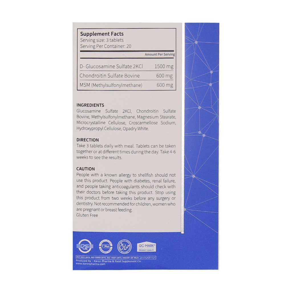 گلوکزآمین سولفات، کندروایتین سولفات سدیم، متیل سولفونیل متان، استئارات، منیزیم، میکروکریستالین سلولز، کراس کارملوز سدیم، هیدروکسی پروپیل سلولز، اپاداری سفید