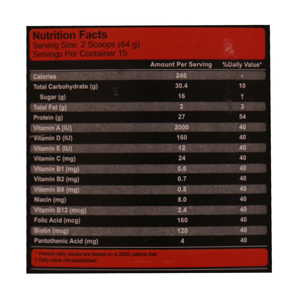 • دارای 42% پروتئین شامل مخلوطی از انواع پروتئین‌های شیر و آب پنیر