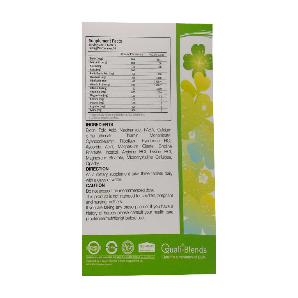 بیوتین، اسید فولیک، نیاسین آمید، پارا آمینوبنزوئیک اسید، کلسیم د-پانتوتنات، تیامین منونیترات، سیانوکوبالامین، ریبوفلاوین، پیریدوکسین هیدروکلراید، آسکوربیک اسید، منیزیم سیترات، کولین بی تارتارات، اینوزیتول، آرژنین هیدروکلراید، لیزین هیدروکلراید، استئارات منیزیم، میکروکریستالین سلولز، روکش اپادرای