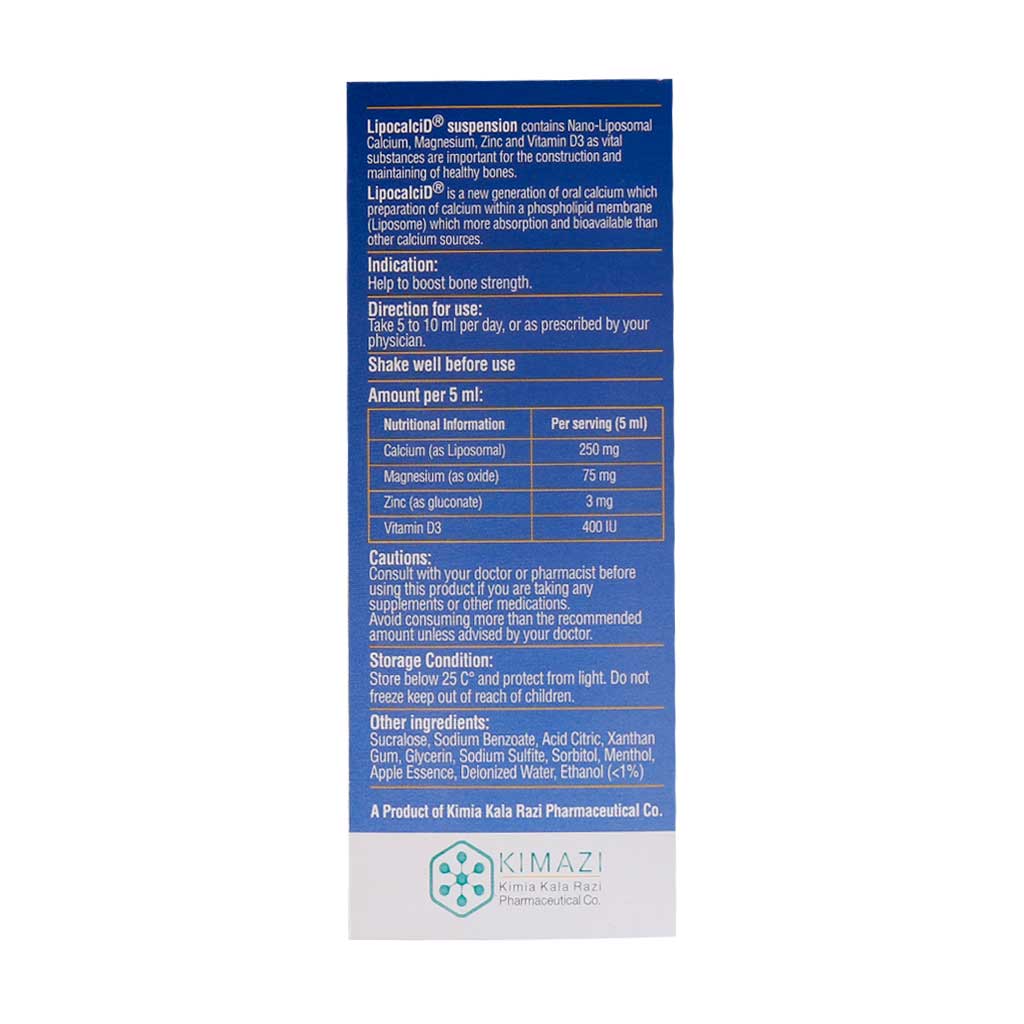 شربت لیپوکلسید کیمیا کالای رازی حاوی کلسیم نانو لیپوزومال، منیزیم، زینک و ویتامین D3 بوده که در حفظ سلامت استخوانها و جلوگیری از پوکی استخوان دارای اهمیت فراوانی است.