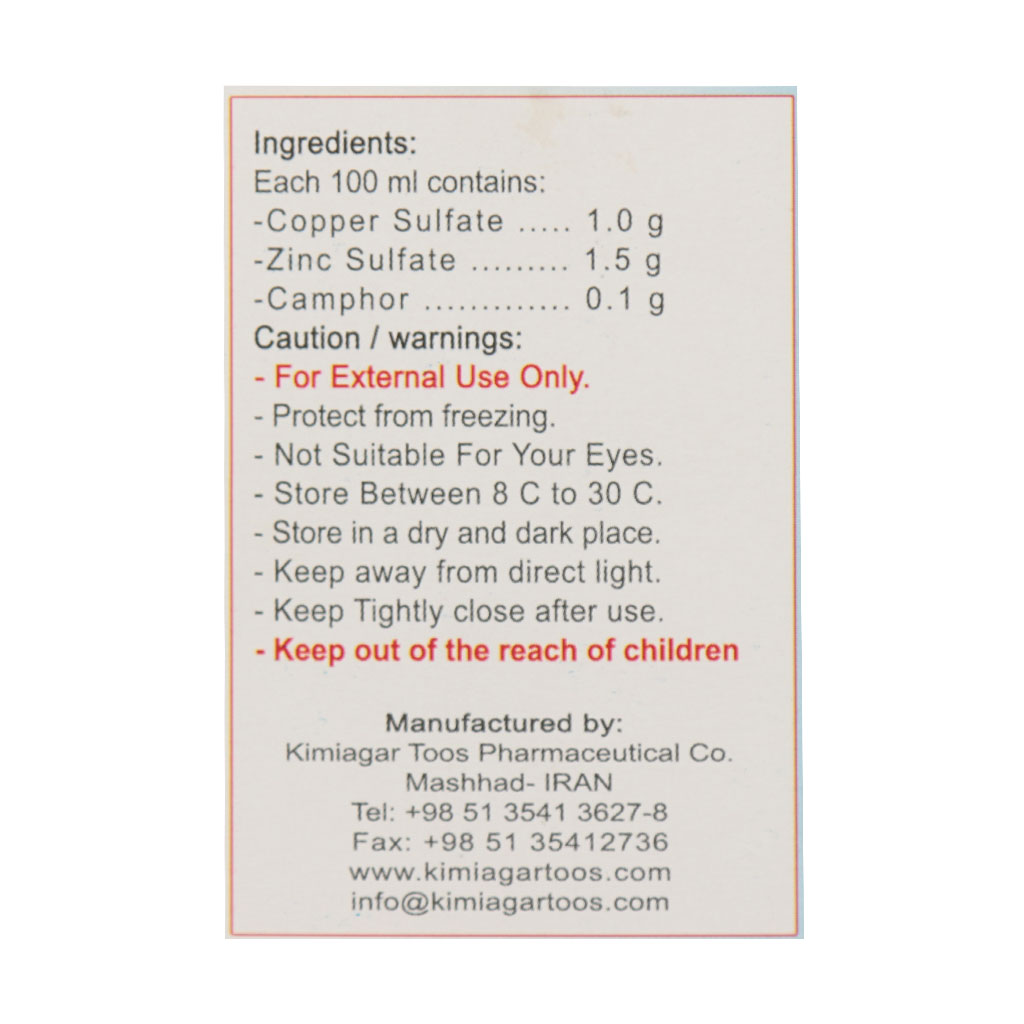 در محلول آب آلیبور کیمیاگر طوس ترکیباتی مانند سولفات روی، سولفات مس و کامفر وجود دارد. این لوسیون در اگزما، زرد زخم و التهاب‌ها به عنوان مرطوب کننده استفاده شده و دارای اثرات قابض و مسکن موضعی است. همچنین دافع حشرات و التیام دهنده محل گزش حشرات نیز هست. سولفات مس موجود در این محصول خاصیت قابض روی بافت‌های مخاطی را داردوسولفات روی نیز دارای خاصیت آنتی سپتیک و کامفر بوده و به عنوان مسکن موضعی و دافع حشرات استفاده می‌شود.