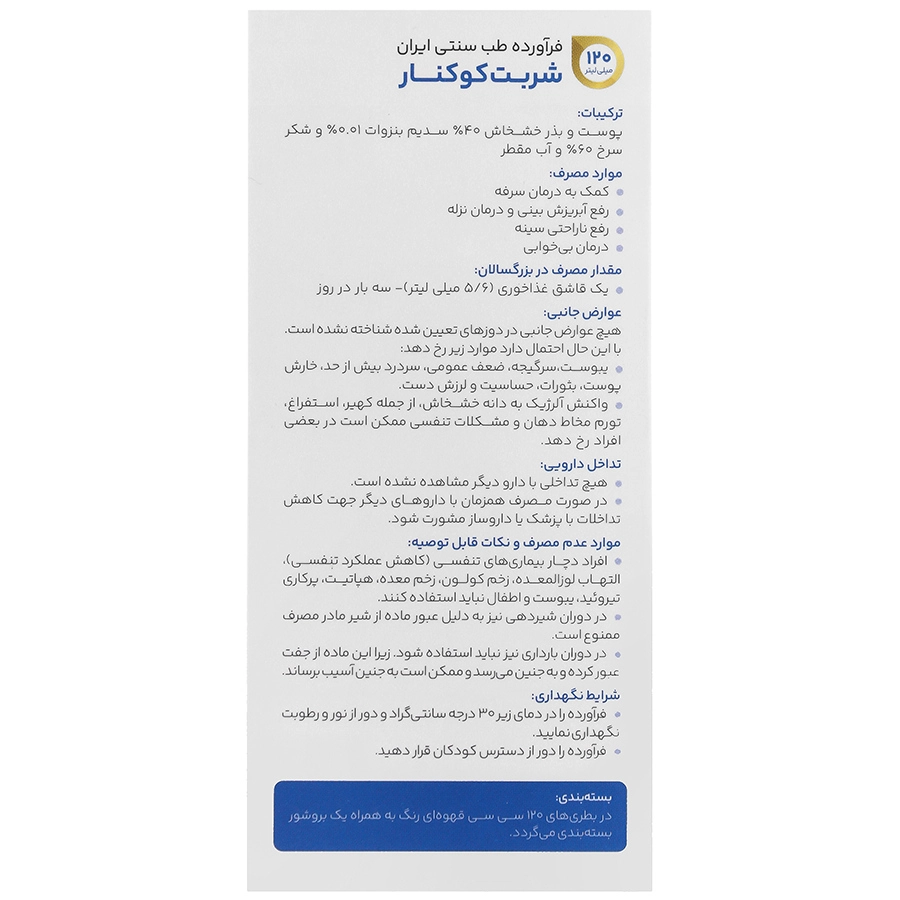 شربت کوکنار، فرآورده طب سنتی ایران است که برای کمک به بهبود سرفه و سرماخوردگی کاربرد دارد. شربت کوکنار حاوی پوست و بذر خشخاش در کنار شکر سرخ است که بر اساس آلکالوئید غالب گیاه خشخاش استاندارد شده است. کوکنار برای کمک به بهبود سرفه، رفع آبریزش بینی و درمان نزله، رفع ناراحتی سینه و درمان بی خوابی طراحی شده است. شربت سینه کوکنار در قوطی شیشه ای 120 میلی لیتری توسط شرکت اکسیر آفرین آریا در ایران تولید می شود.