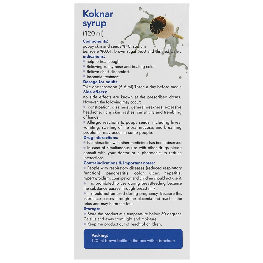 شربت Koknar یک فرآورده طب سنتی است که حاوی 40 درصد پوست و بذر خشخاش و 60 درصد شکر سرخ بوده و بر اساس 0.013 تا 0.02 میلیگرم آلکالوئید غالب گیاه خشخاش در هر 10 میلیلیتر استاندارد شده است.