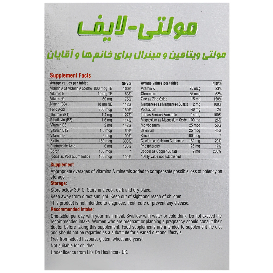 این محصول فاقد گلوتن، مخمر، گندم و طعم دهنده مصنوعی است و برای افراد با رژیم‌های غذایی خاص نیز قابل استفاده است. مولتی لایف انتخابی مناسب برای پیشگیری از کمبودهای تغذیه‌ای، کنترل ریزش مو و بهبود وضعیت پوست و ناخن‌ها است. در نظر داشته باشید جهت ارتقا سلامت خود، به این علت که مولتی لایف آن فاقد امگا 3 هست، می‌توانید در کنار این مکمل اقدام به خرید قرص امگا 3 و مصرف آن نمایید.