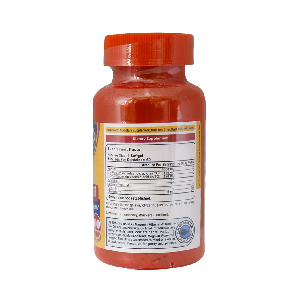 سافت ژل امگا 3 فیش اویل مگنوم ویتامینز حاوی اسیدهای چرب امگا بوده و به تندرسی و سلامت طبیعی بدن کمک میکند. علاوه بر آن این مکمل در جهت حفظ طراوت پوست و مو، تقویت سیستم بینایی و عملکرد طبیعی قلب کمک میکند. EPA و DHA از خانواده اسید چرب امگا 3 از نظر تغذیهای از اهمیت بالایی برخوردار هستند. بدن انسان به صورت معمول توانایی تولید اسیدهای چرب امگا 3 را ندارد و باید از طریق رژیم غذایی یا مکملها این میزان را تامین کند. به همین علت مصرف قرص امگا 3 مگنوم ویتامینز با تامین این مواد حیاتی موجب بهبود سیستم سلامت مصرف کننده میشود.