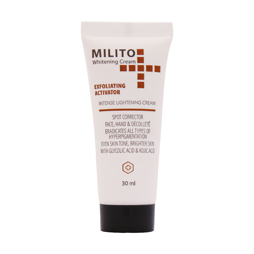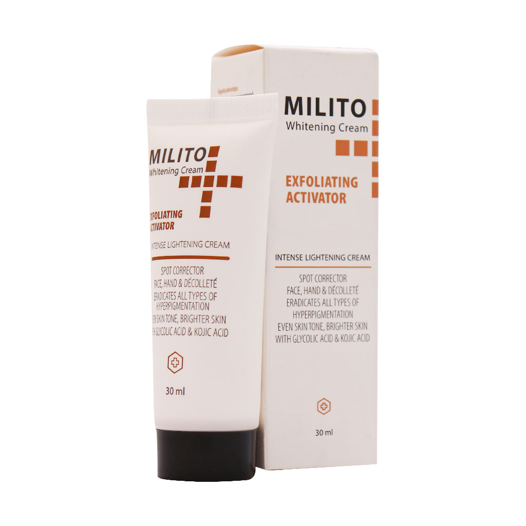 کرم ضدلک میلیتو یک محصول کاربردی جهت جلوگیری و رفع لک و کک و مک صورت است. این کرم با مواد ضد لک پیشرفته از جمله رزورسینول، کوجیک اسید، گلایکولیک اسید و آسکوربیک اسید سبب مهار آنزیم تیروزیناز و کاهش تولید ملانین در پوست و همچنین کاهش سایز و اندازه لکهای قهوهای و تیره پوستی میشود. کرم ضد لک میلیتو دارای ترکیبات روشن کننده است و به شما کمک میکند تا پوستی درخشان و روشن داشته باشید. با این تفاسیر، استفاده منظم از کرم ضد لک موجب کم رنگ شدن لکههای پوستی و از بین رفتن آنها میشود.