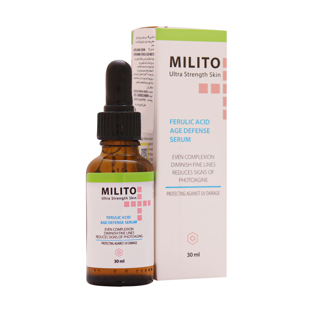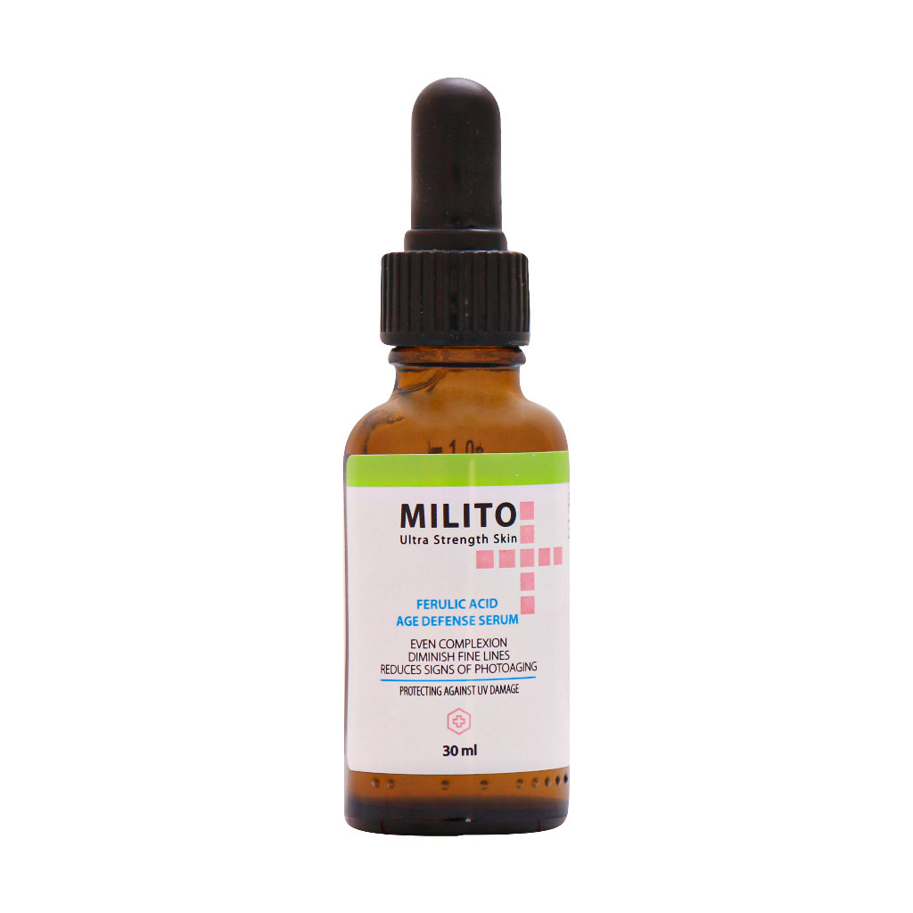 فرولیک اسید ماده موثره موجود در سرم مناسب چروکهای سطحی پوست صورت میلیتو بوده که با خاصیت آنتی اکسیدانی بسیار قوی به کاهش ایجاد خطوط ریز، لکها و چین و چروک پوست کمک میکند. وجود فرولیک اسید در کنار دیگر ترکیبات موثر سرم ضد چروک مانند نیاسینامید به روشن شدن پوست کمک میکند. در کل میتوان گفت سرم ضد چروک میلیتو حاوی فرولیک اسید یک محصول فوق العاده است که به شما کمک میکند پوست خود را جوانتر، شادابتر و زیباتر کنید.
