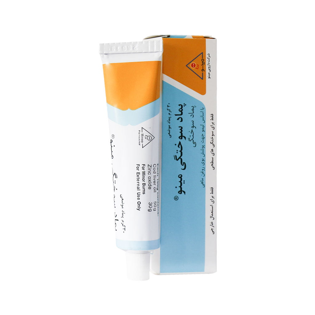 پماد سوختگی مینو دارای اسانس لیمو جهت پوشش بوی روغن ماهی است. این فراورده تنها برای استعمال خارجی، ورم و تاولهای پوستی و سوختگیهای سطحی استفاده میشود.