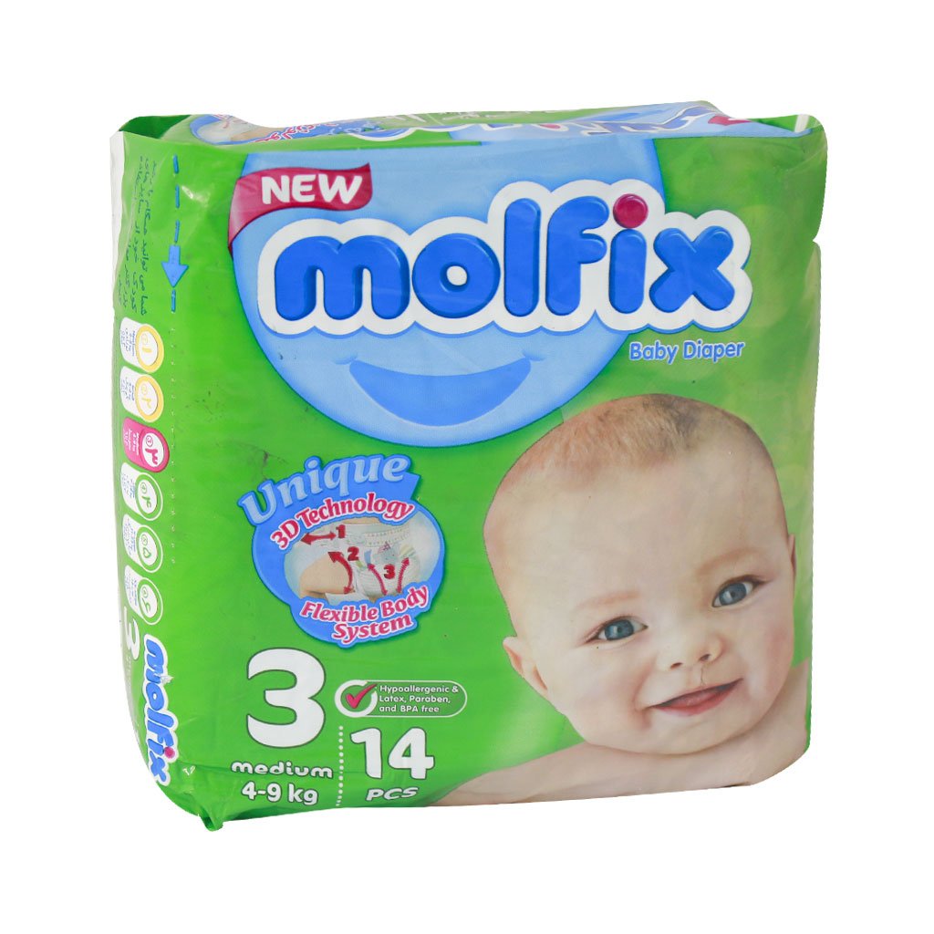 پوشک مولفیکس سایز 3 مناسب کودکان 4 تا 9 کیلوگرم می باشد که تحت لیسانس شرکت حیات کیمیا در کشور ترکیه تولید می شود. پوشک مولفیکس سایز 3 دارای چسب های محکم و ضد حساسیت با لایه های عمودی جهت جلوگیری از نشت می باشد که با وجود لایه عبور دهنده هوا از ادرار سوختگی پاس نوزاد جلوگیری می کند.