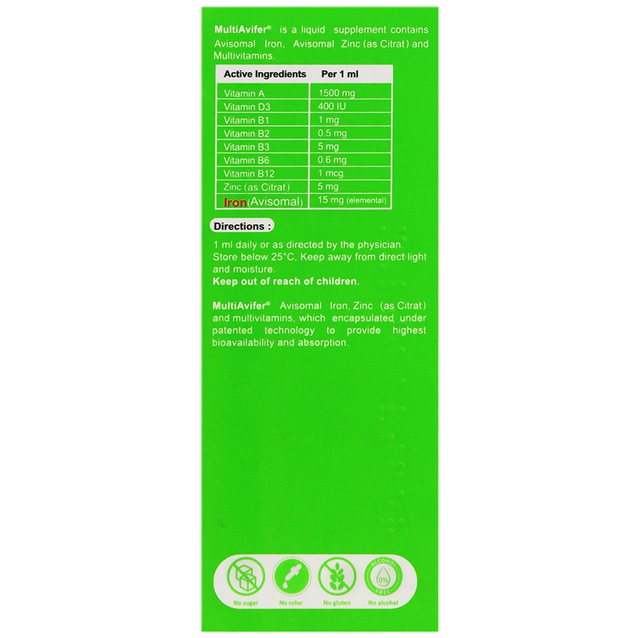 قطره مولتی آویفر آویوال تحت لیسانس کشور انگلستان با تامین ویتامین‌ها و مواد معدنی مورد نیاز کودکان یک مکمل مناسب جهت سلامت عمومی بدن کودکان است. در این مکمل از ترکیبات موثری مانند ویتامین‌های گروه B، زینک، آهن، ویتامین A و دیگر ترکیبات مغذی استفاده شده است که به تقویت سیستم ایمنی، بهبود رشد ذهنی و جسمی، افزایش قد و وزن کودکان کمک می‌کند. همچنین مصرف این مکمل باعث افزایش سطح کلسیم شده و از بروز بیماری‌های استخوانی جلوگیری می‌کند. طعم مطلوب این محصول به افزایش احتمال پذیرش آن در بین کودکان کمک می‌کند.