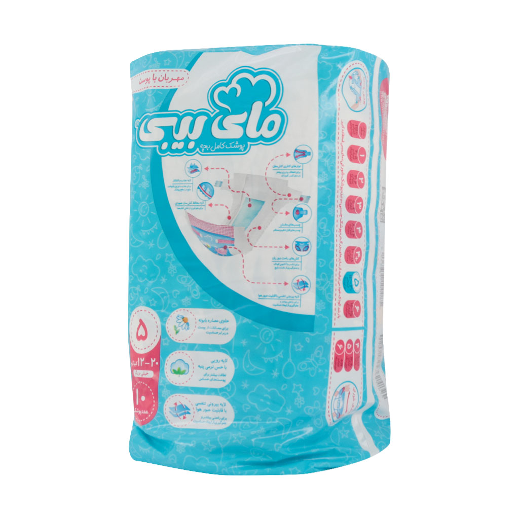پوشک مای بیبی سایز ۵ (۱۲ تا ۲۰ کیلوگرم) حاوی عصاره بابونه بوده و بدین ترتیب از ایجاد حساسیت های پوستی برای کودکان جلوگیری می کند و باعث نرمی و لطافت پوست می شود. این پوشک در سایز خیلی بزرگ می باشد.