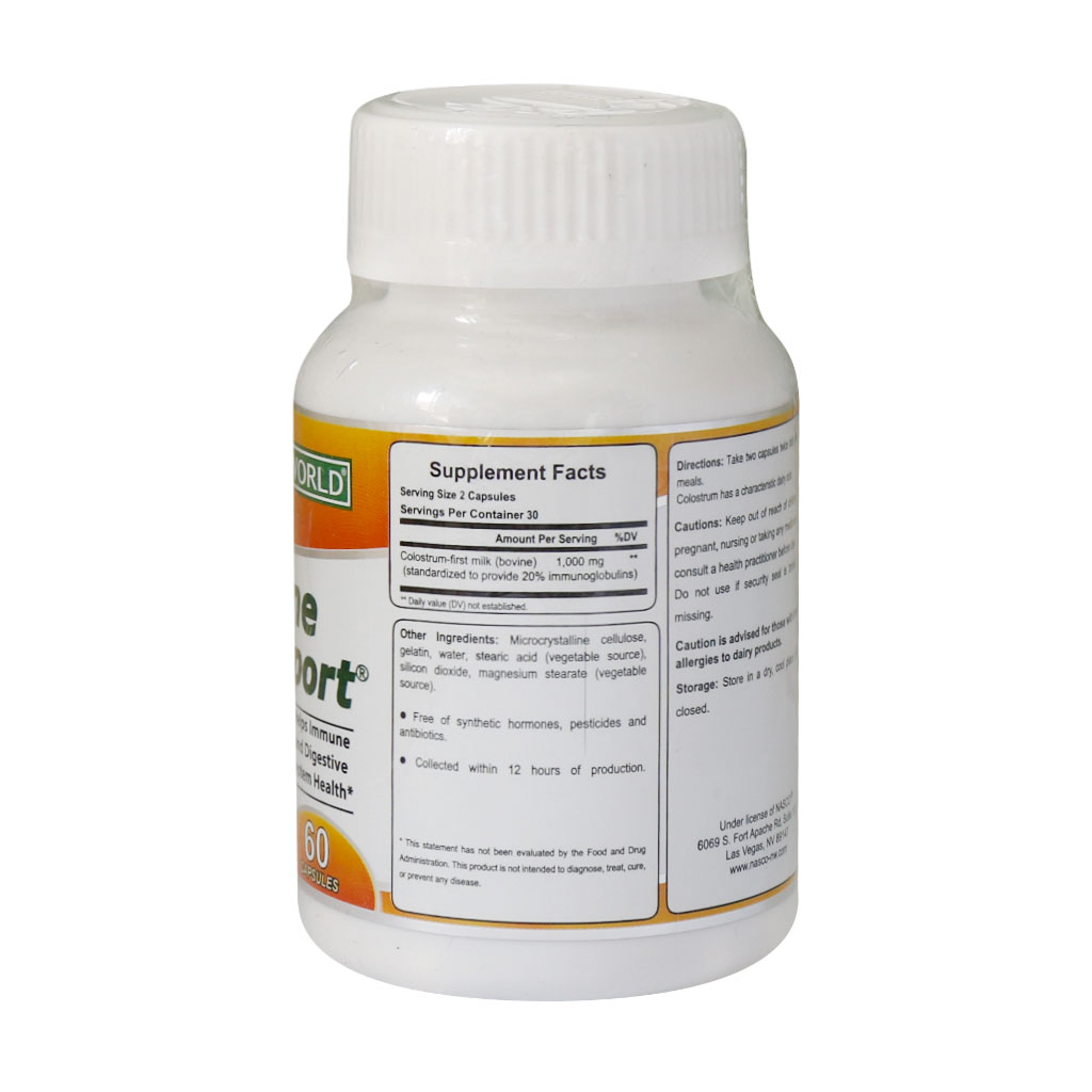 کپسول ایمیون ساپورت نچرال ورلد دارای کلستروم یا آغوز گاوی است که سبب تقویت سیستم ایمنی فرد می شود. آغوز همان شیری است که ابتدای تولد نوزاد در سینه مادر تولید میشود که تامین خوراک و تقویت سیستم ایمنی نوزاد را بر عهده دارد. این شیر حاوی پروتئینهای لاکتوفرین، مواد معدنی، آنزیمها، ویتامینها و فاکتورهای مهم رشد است که نهایتا سیستم ایمنی را ارتقا بخشیده و تحریک کننده رشد سلول، تجدید کننده قوا و ارتقا سلامتی است. فاکتورهای رشد و ایمنی در آغوز گاو نیز همانند ساختارهای مولکولی در آغوز انسان است. کلستروم گاوی لاکتوفرین و آنتی بادیها که برای مقابله با باکتری و ویروسها استفاده میشود را دارا است. این آنتی بادیها شامل ایمونوگلوبینهای M، A و G بوده که همگی توسط بدن مصرف میشوند و حیاتی محسوب میشوند.