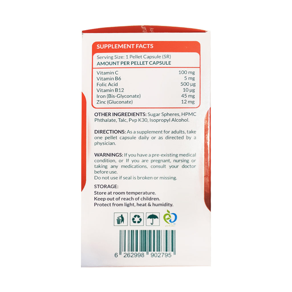 کپسول ویتا فرو نیچرز پلنتی حاوی ویتامین سی، فولیک اسید، آهن، زینک، ویتامین B6 و B12 است. این محصول ضمن تامین آهن موردنیاز بدن، از فقر آهن و کم خونی جلوگیری میکند.