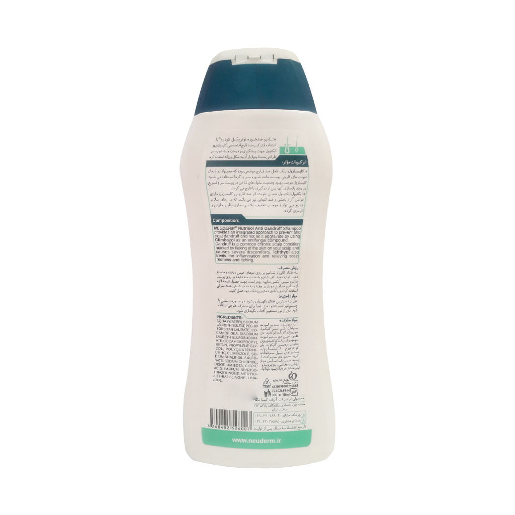شامپو ضد شوره نوتریسل نئودرم حاوی ترکیب ضد قارچ کلیمبازول به همراه ایکتیول بوده که شوره سر را برطرف میکند و علاوه بر آن خارش و التهاب پوست سر را رفع میکند.