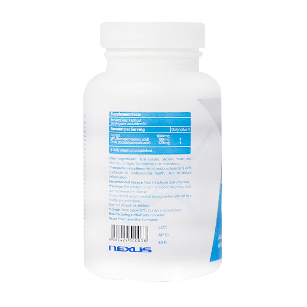 سافت ژل امگا 3 1000 میلی گرم نکستایل حاوی اسیدهای چرب ضروری بدن است که به سلامت قلب و عروق، تقویت سلامت عمومی بدن و کاهش التهاب کمک موثری میکند. همچنین این محصول در بهبود عملکرد طبیعی مغز و قدرت بینایی نیز موثر است. در هر کپسول از این مکمل، 1000 میلی گرم روغن ماهی به کار رفته است که در این میزان، 180 میلی گرم EPA و 120 میلی گرم DHA وجود دارد.