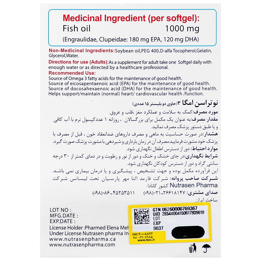 امگا 3 نوتراسن تحت لیسانس شرکت نوتراسن فارما کانادا بوده و در بلیسترهای 15 عددی و با فرم دارویی سافت ژل تولید و بسته بندی شده است. در نظر داشته باشید در کنار مصرف این محصول، خرید کپسول کوآنزیم کیوتن و استفاده از آن، تاثیر بیشتری بر سلامت قلب و عروق دارد و خطر بیماری قلبی را کاهش میدهد.