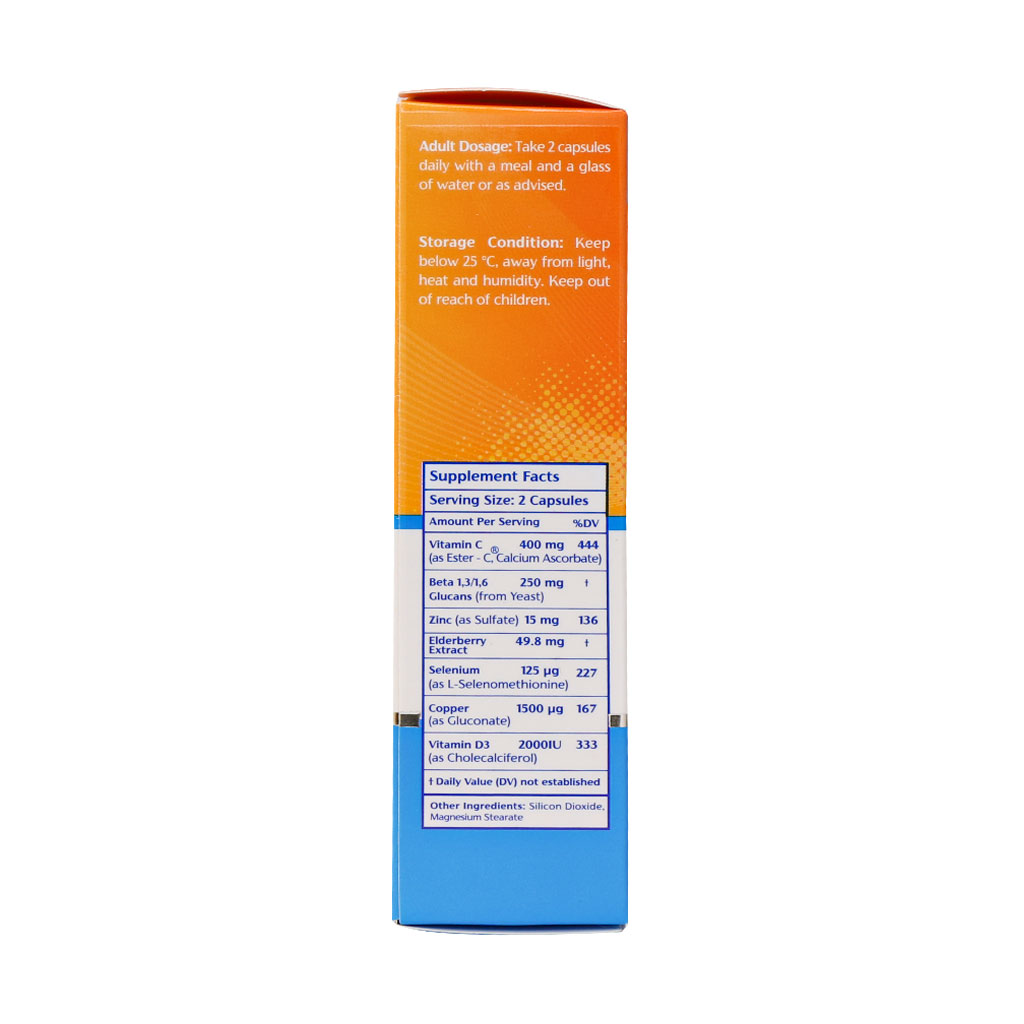 هر کپسول حاوی 200 میلی گرم ویتامین C، 125 میلی گرم بتاگلوکان‌ها، 7.5 میلی گرم روی، 24.9 میلی گرم عصاره گیاه آقطی، 62.5 میکروگرم سلنیوم، 750 میکروگرم مس، ویتامین D3 1000u