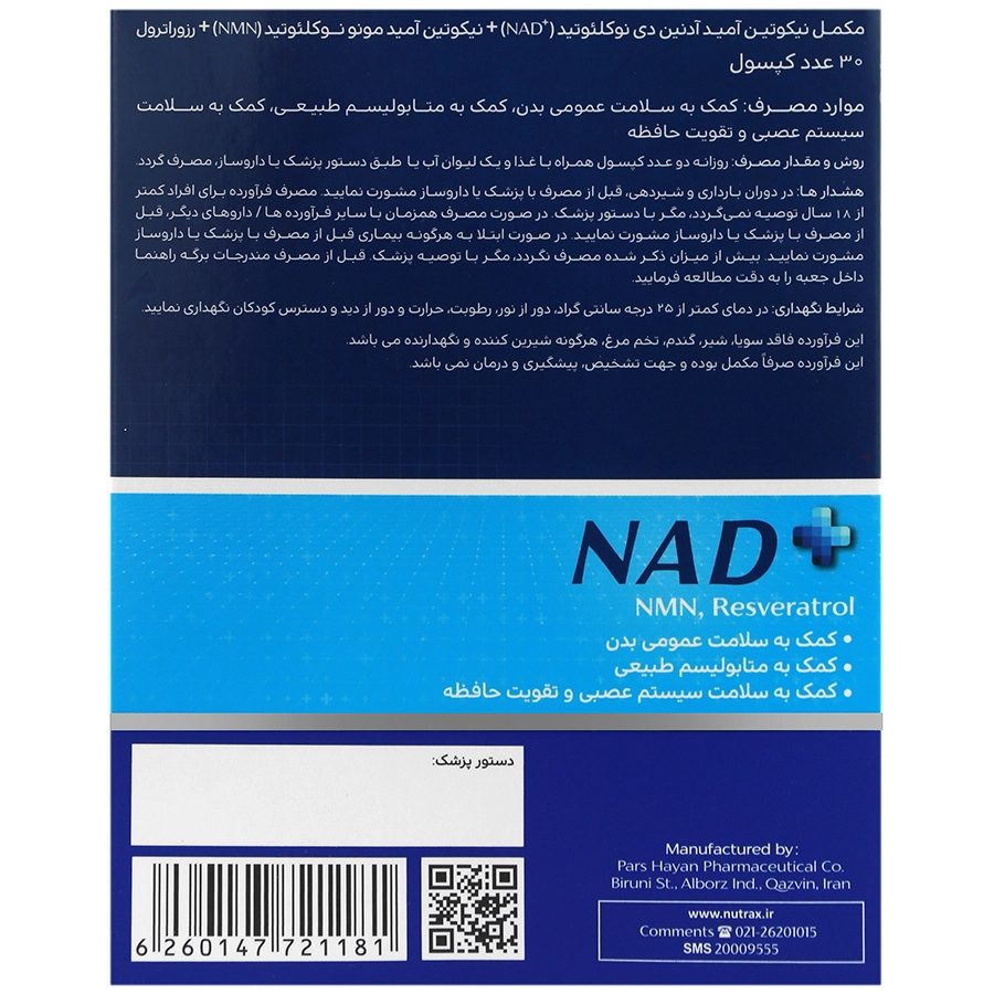 کپسول ان آ دی پلاس نوتراکس یک مکمل حاوی نیکوتین آمید آدنین دی نوکلئوتید، نیکوتین آمید مونو نوکلئوتید و رزوراترول بوده که به بهبود عملکرد نورونهای مغزی، سلامت سیستم عصبی و تقویت حافظه کمک میکند.