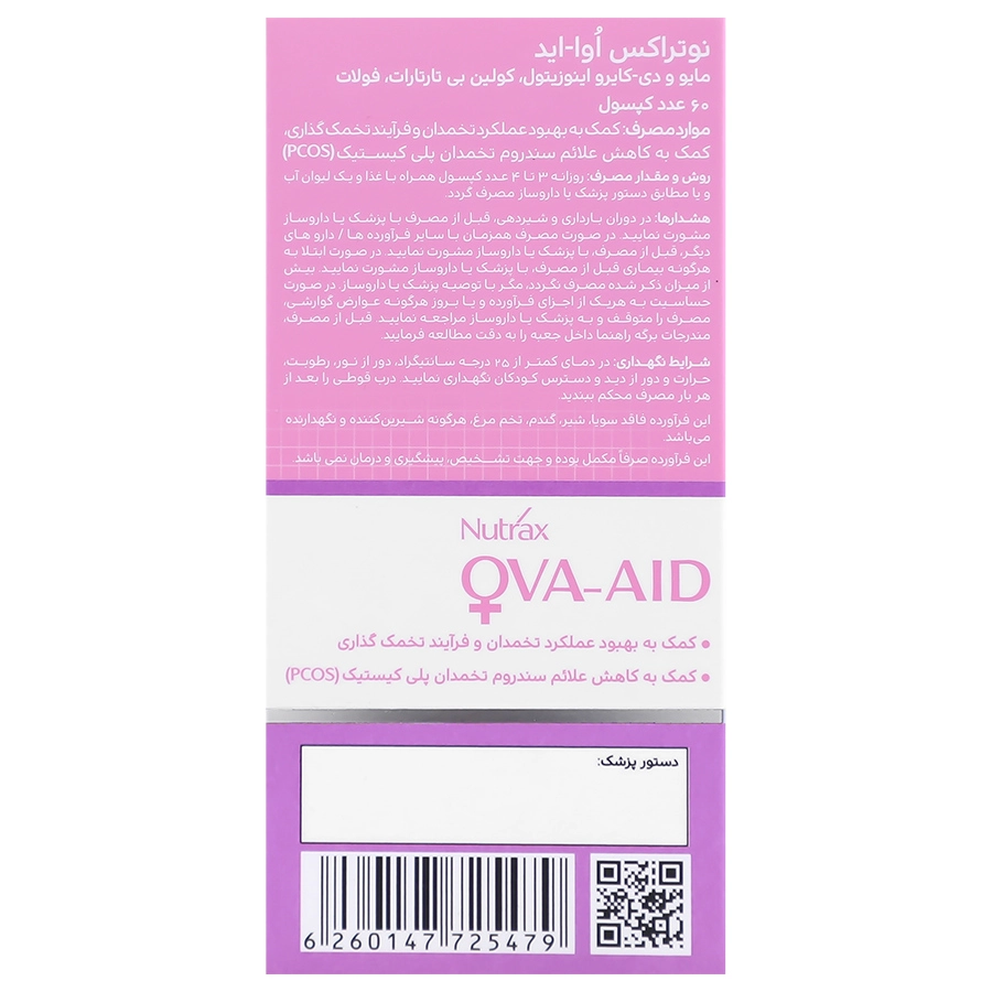 کپسول اوا اید نوتراکس با داشتن ترکیبات موثر حاوی مایو و دی کایرو اینوزتول، کولین بی تارتارات و فولات یک مکمل غذایی مناسب جهت سلامت باروری زنان است. ترکیبات موجود در این محصول، نقش مهمی در بهبود عملکرد سیستم باروری، تنظیم قند خون و سلامت عمومی بدن دارد. این مکمل در قوطی پلاستیکی 60 عددی توسط شرکت پارس حیان تولید و به طور ویژه برای زنان مبتلا به سندروم تخمدان پلی کیستیک مفید بوده و با بهبود مقاومت به انسولین و تنظیم چرخه قاعدگی احتمال بارداری را در افراد افزایش میدهد. در صورت دریاف مجوز پزشک، میتوانید در کنار این ممل با هداف حفظ سلامت تخمدانها اقدام به مصرف قرص امگا 3 نمایید.