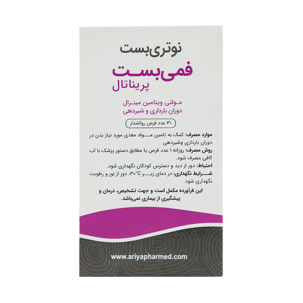 قرص فمی بست پریناتال نوتری بست یک مکمل تخصصی برای دوران بارداری و شیردهی است که با دوزهای استاندارد و فرمولاسیون علمی توسط شرکت معتبر آریا فارمد پیشگامان سلامت ساخته شده است. این محصول در بسته بندی قوطی پلاستیکی 30 عددی عرضه میشود و تمام ویتامینها و مواد معدنی ضروری برای سلامت مادر و رشد صحیح جنین را تامین میکند. البته شایان ذکر است برای زنانی که به دنبال مراقبت کامل دوران بارداری هستند، استفاده همزمان قرص امگا 3 میتواند به تکامل بهتر مغز و سیستم عصبی جنین کمک نموده و تجربهای کاملتر از دریافت ریز مغذیهای ضروری را فراهم کند.