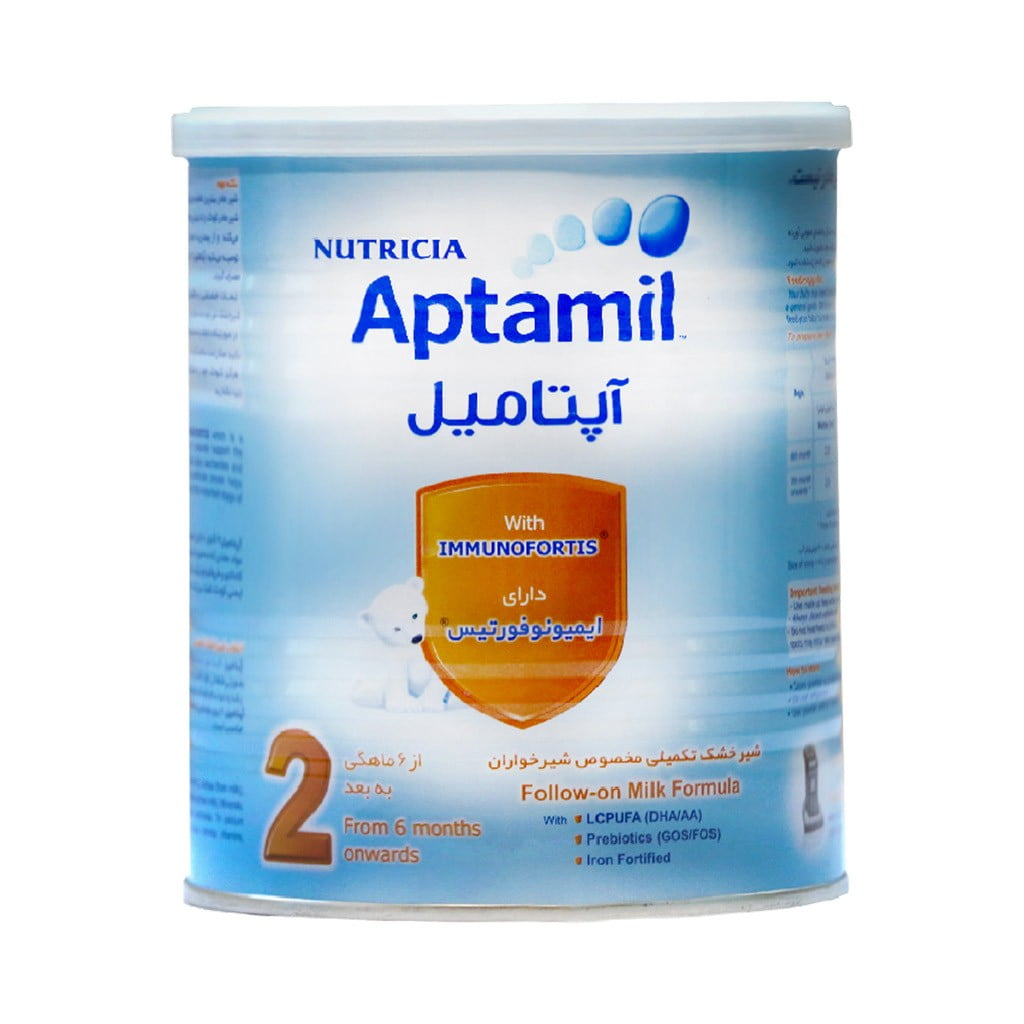 شیر خشک آپتامیل 2 نوتریشیا شیر خشکی کاملا سازگار با نیازهای تغذیهای نوزاد 6 تا 12 ماه است و در مقایسه با فرمول آپتامیل 1، آپتامیل 2 تا حدودی حاوی پروتئین، مواد معدنی و ریز مغذی های بیشتری است درحالی که محتوای آن دارای چربی کمتری است در ساختار آن کربوهیدرات مالتو دکسترین دارای 30% سهم است و محتوی ویتامین ها تقریبا همان است. ارتباط بین کازئین و پروتئین آب پنیر 50:50 است که به تازگی در همراهی با توصیه های کمیته اروپا در تغذیه، برای تحمل بهتر پروتئین های شیر گاو و کاهش خطرات آلرژی ایجاد شده است. آپتامیل 2 همراه با غذای کمکی تمام شرایط برای رشد طبیعی، توسعه یک نوزاد سالم از 6 تا 12 ماه را فراهم می کند. همچنین دارای پره بیوتیک جهت کمک به گسترش سالم سیستم ایمنی بدن نیز است.