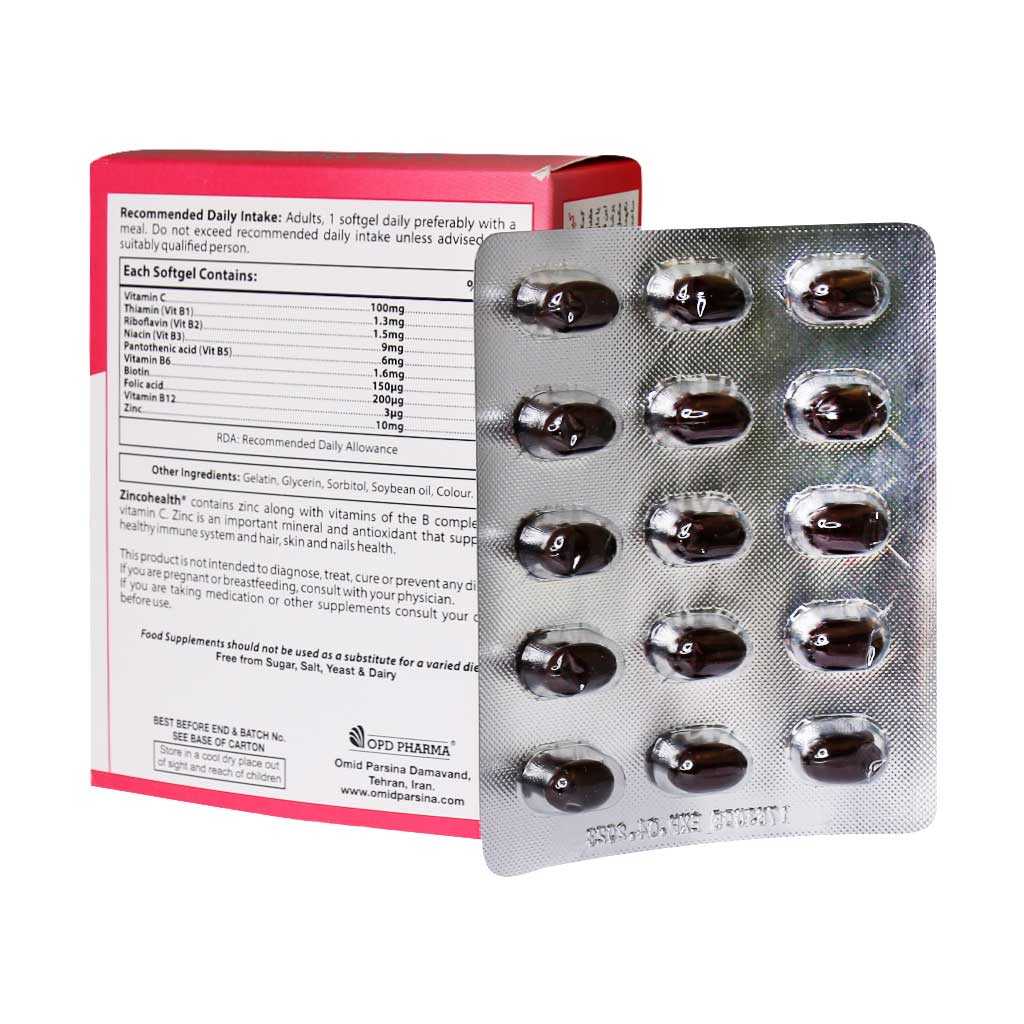 سافت ژل زینکو هلث او پی دی فارما یک مکمل تغذیهای سرشار از ویتامینها و زینک بوده که به با خاصیت آنتی اکسیدانی خود به حفظ سلامت سیستم ایمنی، پوست، مو و ناخن کمک میکند.