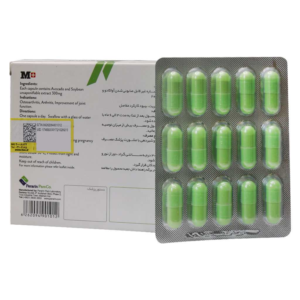 کپسول آسوپرا ۳۰۰ میلی گرم پرارین پارس حاوی عصاره سویا و آووکادو است که این ترکیبات تاثیر مثبتی در بهبود روند آرتروز و بهبود تراکم استخوان ها دارد. این محصول حاوی ۳۰۰ میلی گرم عصاره غیرصابونی آواکادو و سویا است که به بازسازی و ترمیم غضروف در افراد مبتلا به استئوآرتریت کمک میکند.
