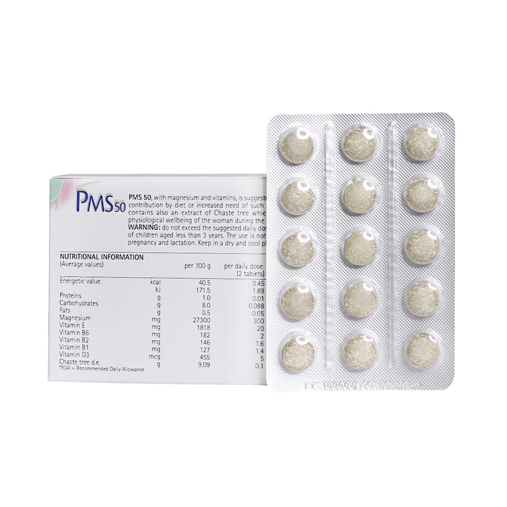 قرص پی ام اس 50 فارمالایف یک مکمل غذایی دارای منیزیم، ویتامین ها و عصاره ویتاگنوس (Vitex Agnus Castus) و با نام عمومی Chasteres می باشد. با مصرف این قرص در دوره قاعدگی زندگی فعال، شیرین و با آرامش می شود. اختلالات و سندرم قبل از قاعدگی از قبیل سر درد، سرگیجه، اضطراب، افسردگی، اختلالات عصبی، کمر درد، درد مفاصل، دردهای شکمی و غیره در بعضی از دوشیزگان و بانوان به حدی است که در زندگی روزمره و حتی کار روزانه، اثر منفی دربر دارد. PMS با عدم تعادل بین سطح استروژن و پروژسترون در بدن ایجاد می گردد. همچنین سطح پایین سروتونین در ایجاد و پیشرفت PMS می تواند موثر باشد. مطالعات فارماکولوژیکی و انجام شده بر روی قرص پی ام اس-50 فارمالایف نشان داده که این محصول دارای فلاوونوئیدها و گلیکوزیدها بوده که عدم تعادل هورمون های زنانه را بهبود بخشیده و همچنین ترشح پرولاکتین و FSH را کاهش داده و موجب تحریک و تولید LH می گردد که در پی آن علائم سندرم فوق کاهش می یابد.