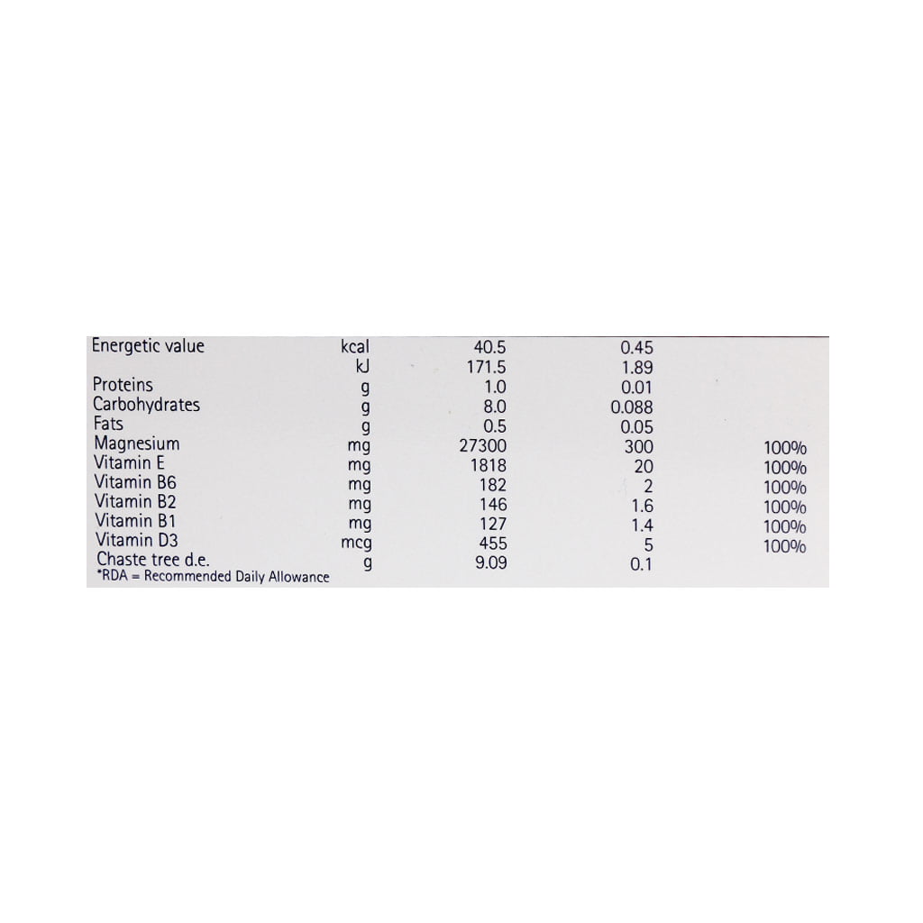 اکسید منیزیم، عصاره چست ویتاگنوس، ویتامین E، ویتامین C، ویتامین B1، ویتامین B2، ویتامین B6، ویتامین D3