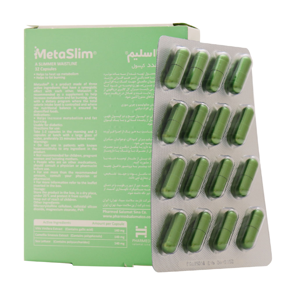 کپسول متا اسلیم فارمد سلامت سینا یک مکمل غذایی جهت افزایش متابولیسم بدن و چربی سوزی است. در ترکیبات این فرآورده نوعی انگور، کاهو دریایی و کاملیا سیننسیس به چشم میخورد. عصاره انگور موجود در کپسول متا اسلیم، منبع غنی از آنتی اکسیدانها است که علاوه بر محافظت از غشاهای سلولی در برابر آسیبهای ناشی از رادیکالهای آزاد، به سوختن چربیهای بدن نیز کمک میکند. کاملیا سیننسیس نیز نوعی درختچه همیشه سبز است که از عصاره آن برای بهبود هضم غذا و افزایش سوخت و ساز بدن استفاده میشود.