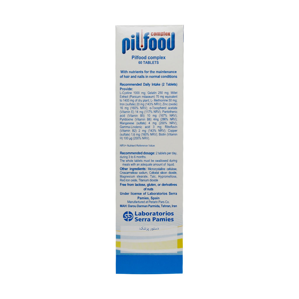 این محصول حاوی انواع ویتامینهای گروه B و املاح معدنی همچون آهن و روی بوده که در رشد مو و ناخن نقشی اساسی دارند. 90 درصد از ساختار مو را کراتین تشکیل میدهد. قرص Pilfood Complex حاوی موادی است که به تولید کراتین نیز کمک میکنند.