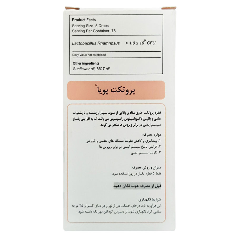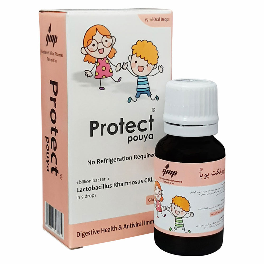 قطره 15 میلی لیتری پروتکت پویا گسترش میلاد فارمد یک پروبیوتیک اختصاصی جهت تقویت سیستم ایمنی نوزادان و کودکان می باشد. لاکتوباسیلوس رامنوسوس سویه باکتریایی موجود در این مکمل بوده که در تقویت سیستم ایمنی، افزایش پاسخ سیستم ایمنی در برابر ویروس ها، پیشگیری و کاهش ابتلا به عفونت های تنفسی و گوارشی عملکرد چشمگیری دارد. قطره پروتکت پویا فاقد تخم مرغ، ذرت، گندم، گلوتن، سویا، رنگ و نگهدارنده می باشد.