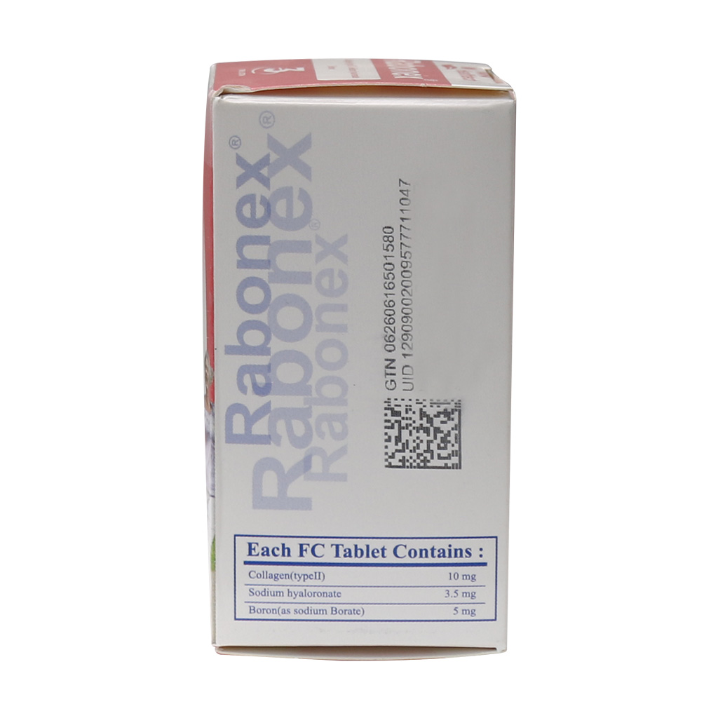 کلاژن (نوع II) ماده مؤثره در افزایش سیستم ایمنی و حفظ سلامت و ترمیم غضروف‌هاست در رابونکس به میزان ۴۰ میلی گرم مخلوط شده با پتاسیم کلراید موجود است. حداقل ۱۳ نوع کلاژن در انسان شناسایی شده‌اند که هر کدام در بافت خاصی وجود دارند. معروف‌ترین نوع کلاژن که در غضروف شفاف دیده می‌شود، کلاژن (نوع II) است. کلاژن سخت‌ترین رشته بافت پیوندی است و با آنزیم کلاژناز (حل کننده کلاژن) از بین می‌رود، ترمیم آن بسیار سخت بوده و به زمان طولانی نیاز دارد. هیالورونیک اسید نیز یکی از مهم‌ترین ترکیبات تشکیل دهنده مایع بین مفصلی بوده و در مایع مفصلی، به منظور لوبریکاسیون مفصل‌ها و حرکت نرم ضروری است. در اثر افزایش سن، میزان سطح هیالورونیک اسید کاهش می‌یابد. اسید هیالورونیک که از انواع ماده زمینه بی شکل است از پراکنده شدن بیهوده کلاژن در بین سلول‌ها جلوگیری می‌کند.