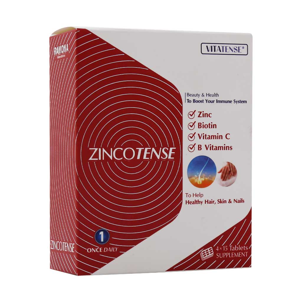 قرص زینکوتنس رامونا حاوی زینک، بیوتین، ویتامین C و ویتامین‌های گروه B به سلامت پوست، مو و ناخن و تقویت سیستم ایمنی کمک موثری می‌کند.