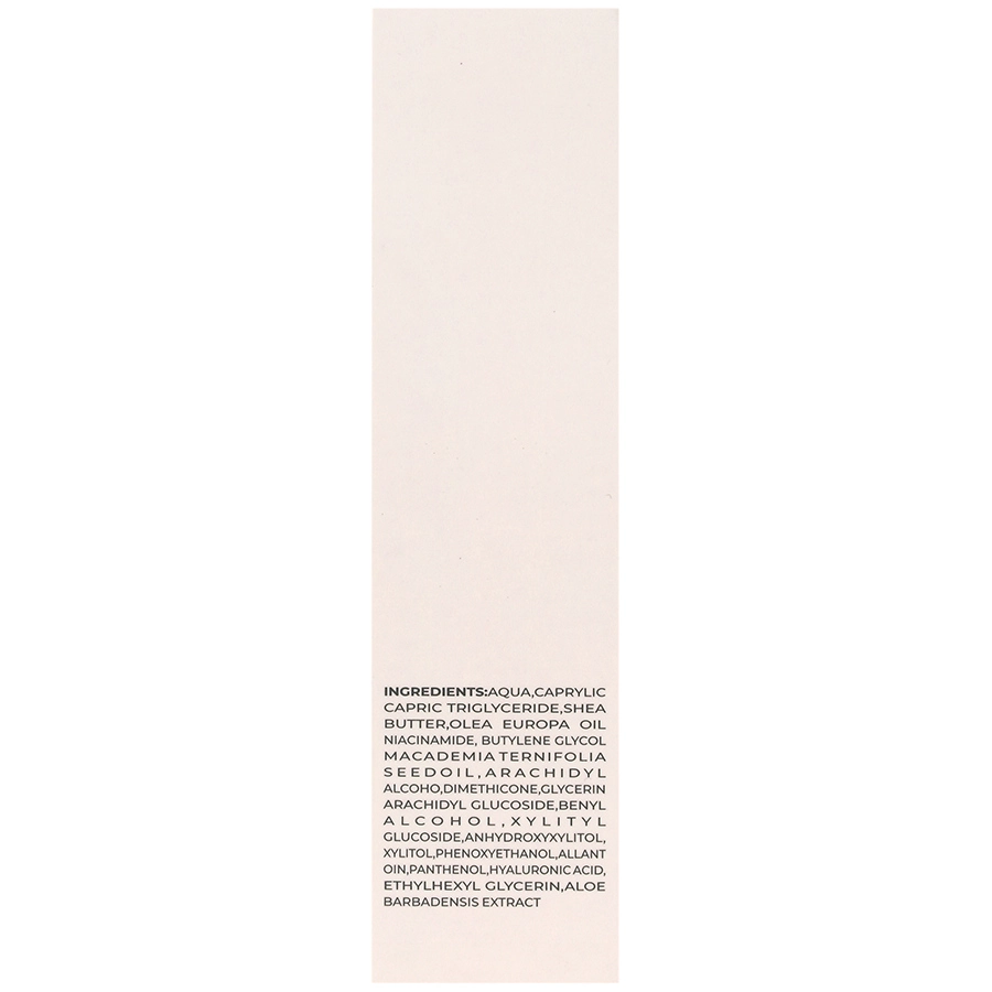 آب، کاپریلیک کاپریک تری گلیسرید، شی باتر، روغن زیتون، نیاسین آمید، بوتیلن گلیکول، روغن دانه ماکادمیا، آراشیدیل الکل، دایمتیکون، گلیسرین آراشیدیل گلوکوزاید، بهنیل الکل، زایلیتویل گلوکوزاید، انهیدروکسی زایلیتول، زایلیتول، فنوکسی اتانول، آلانتوئین، پانتنول، هیالورونیک اسید، اتیل هگزیل گلیسرین، آلوئه ورا.