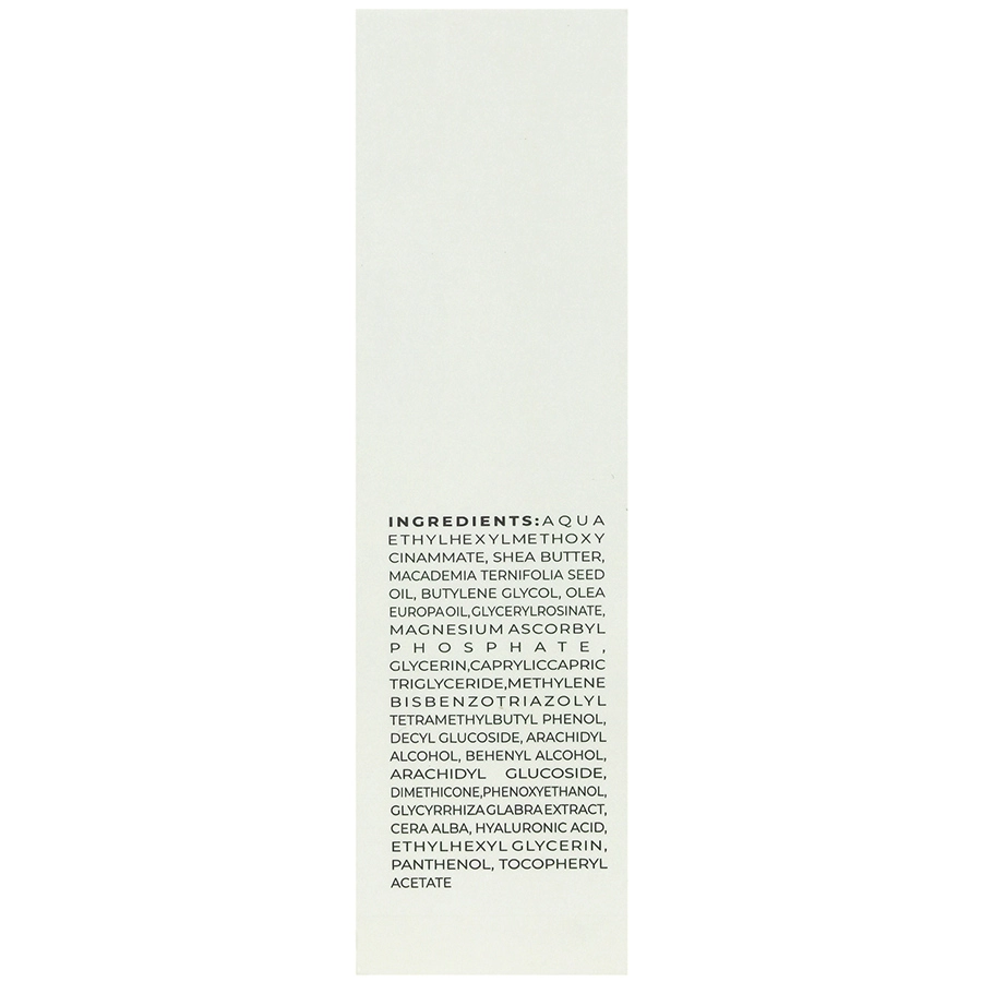 آکوا، اتیل هگزیل متوکسی سینامات، شی باتر، روغن دانه ماکادمیا، بوتیلن گلیکول، روغن اولئا یوروپا، گلیسیریل روزینات، منیزیم آسکوربیل فسفات، گلیسیرین، کاپریلیک/کاپریک تری گلیسرید، متیلن بیس بنزوتریازولیل تترا متیل بوتیل فنول، دسیل گلوکوزید، آراشیدیل الکل، بهنیل الکل، آراشیدیل گلوکوزید، دایمتیکون، فنوکسی اتانول، عصاره شیرین بیان، موم زنبور عسل، هیالورونیک اسید، اتیل هگزیل گلیسیرین، پانتنول، توکوفریل استات