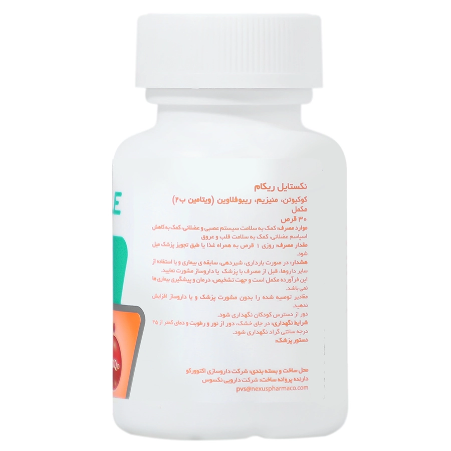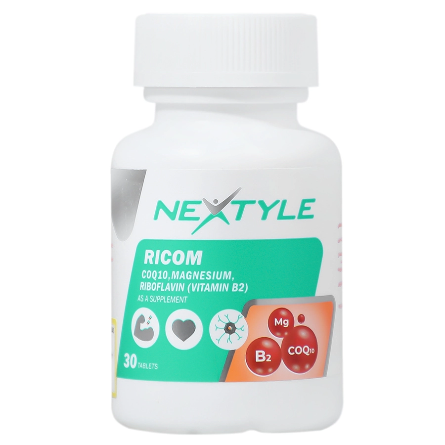قرص ریکام نکستایل 30 عددی حاوی کوآنزیم کیوتن، منیزیم و ریبوفلاوین (ویتامین B2) میباشد. این محصول به سلامت سیستم عصبی و عضلانی، کاهش اسپاسم عضلانی، کمک به سلامت قلب و عروق کمک میکند.