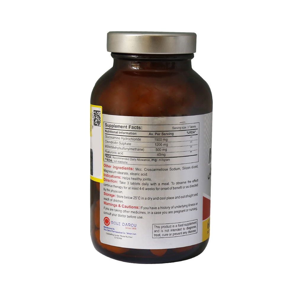 به ازای هر دو عدد قرص حاوی ۱۵۰۰ میلی گرم گلوکزآمین هیدروکلراید، ۸۰۰ میلی گرم کندرویتین سولفات، هیالورونیک اسید، ۷۵۰ میلی گرم متیل سولفونیل متان(MSM) بوده که در ادامه به توضیح عملکرد هر یک از آنها میپردازیم: